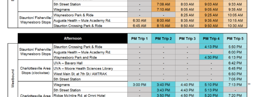 We diligently worked to create a schedule that better aligns with the needs of current and future passengers and that works for the greatest number of riders. This schedule was carefully crafted using input from annual surveys, website and email write-ins, and conversations with drivers. Additionally, we analyzed data including trip and stop usage, employer start and end times, and projected ridership.