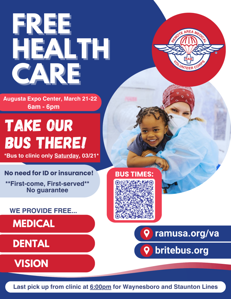 BRITE Bus will provide transportation to the UVA-hosted Remote Area Medical (RAM) Clinic at the Augusta Expo (277 Expo Rd., Fishersville, VA 22939) on Saturday, March 21.
